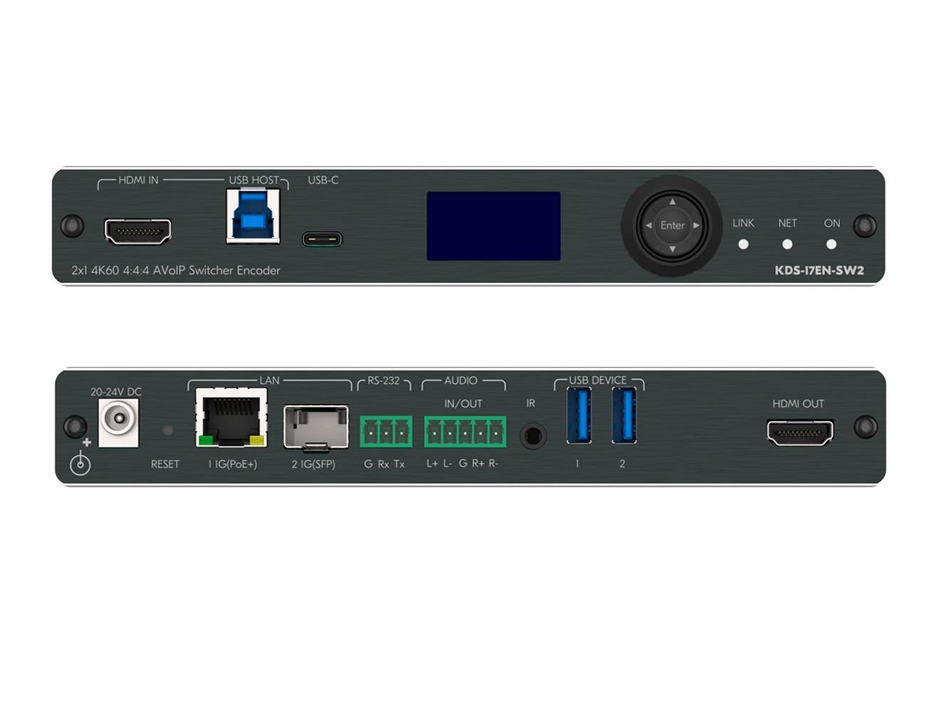 KDS−17EN−SW2 2x1 4K60 4:4:4 AVoIP Switcher Encoder with Dante for streaming 4K video and audio signals, via Ethernet over copper or optical cable in unicast (one−to−one) or multicast (one−to−many) configurations. Supports audio Dante, USB, IR, RS−232 or CEC signals.