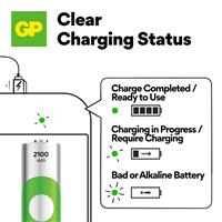 - Grön LED lyser stadigt när batterierna är fulladdade
