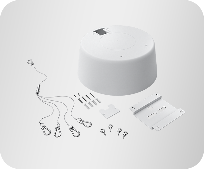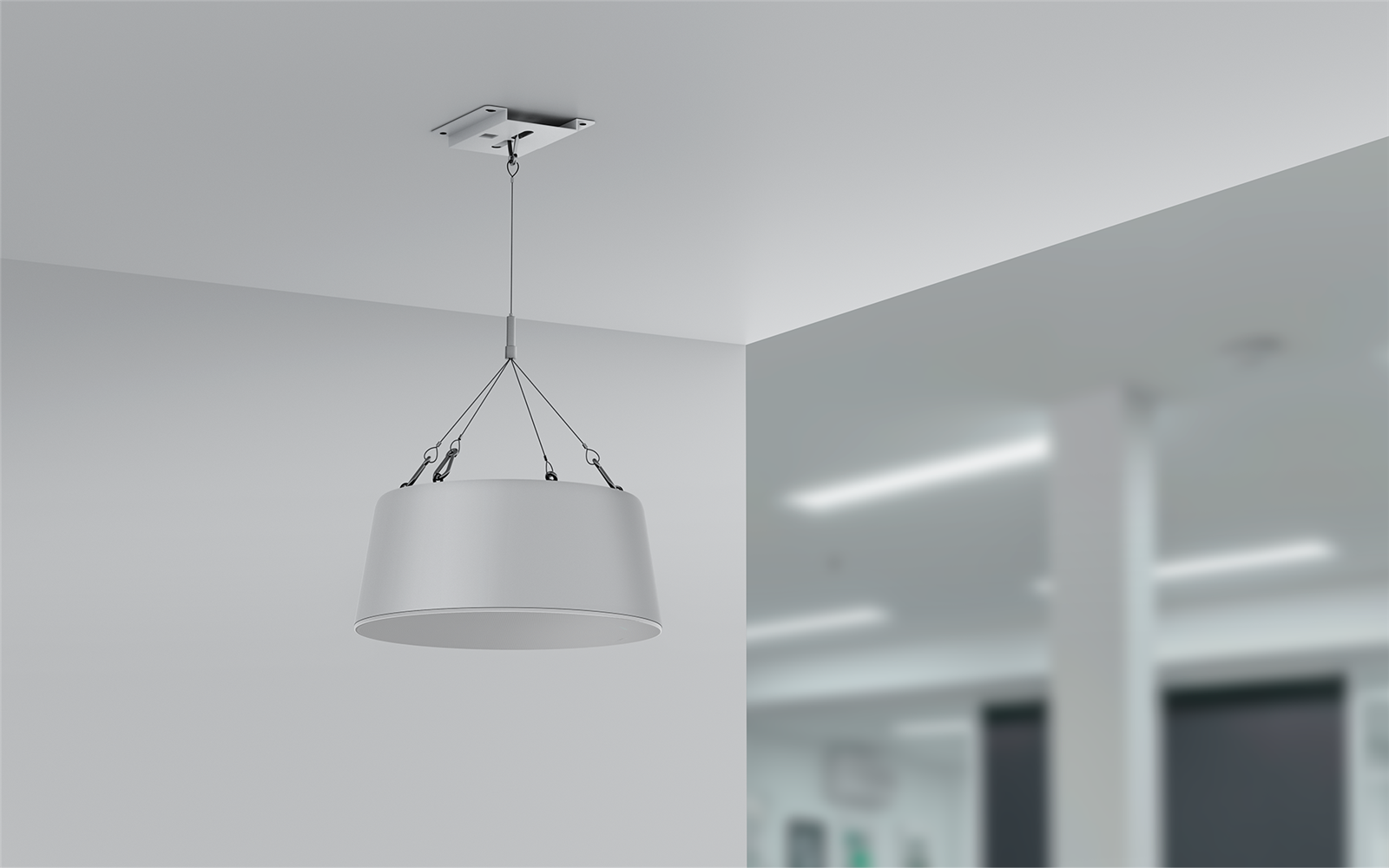 The Pendant Mount Enclosure with aesthetic cover is designed to house the CS10 ceiling speaker. With an elegant white appearance, it blends seamlessly into open-ceiling and modern interior while ensuring both acoustic performance and visual consistency. Ideal for spaces where ceiling cutouts are not feasible, it comes complete with mounting hardware and a safety cable kit for secure, professional installation.