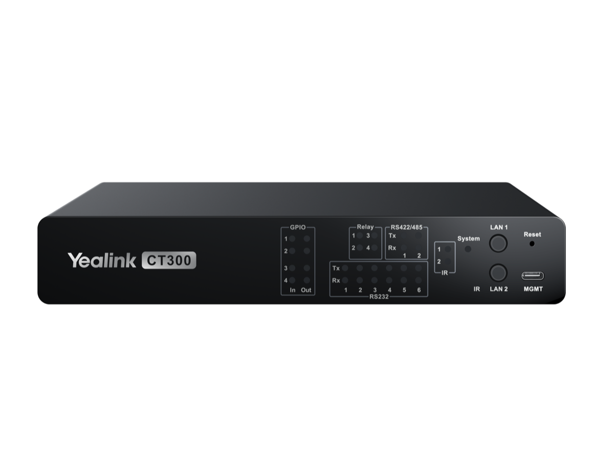 - Comprehensive Hardware Interfaces for Seamless Device Control The Yealink CT300 features an extensive array of hardware interfaces—RS232, RS422/485, Relay, GPIO, IR learning, and IR out control—providing unmatched flexibility for device integration and control. Its versatile connectivity empowers seamless automation and precise management of diverse room devices, making it an ideal solution for professional AV environments.