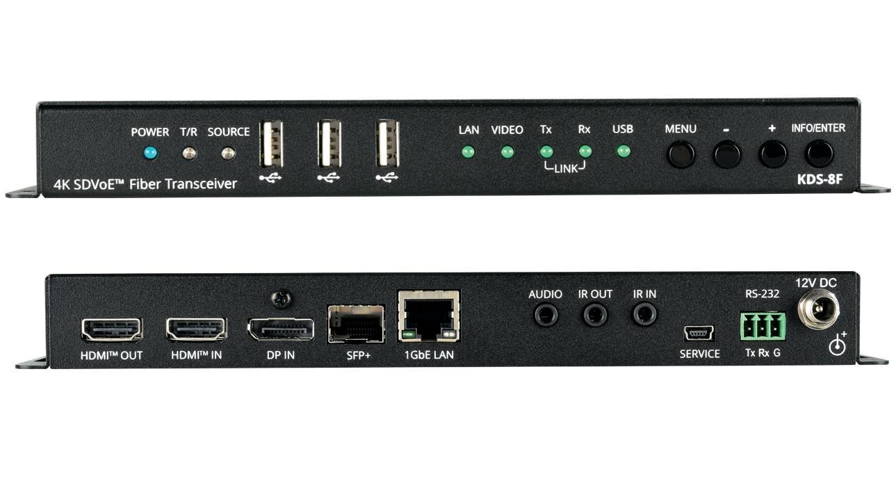 KDS−8F is a high−performance, zero latency, 4K@60Hz (4:4:4) video streaming transceiver for streaming via Ethernet over single−mode and multi−mode optical fiber. KDS−8F can be set as either an encoder or decoder. As an encoder, it encodes and streams the HDMI or DisplayPort input along with IR, RS−232, analog audio and USB, over an IP network. As a decoder, it receives the encoded signal and decodes it for output.