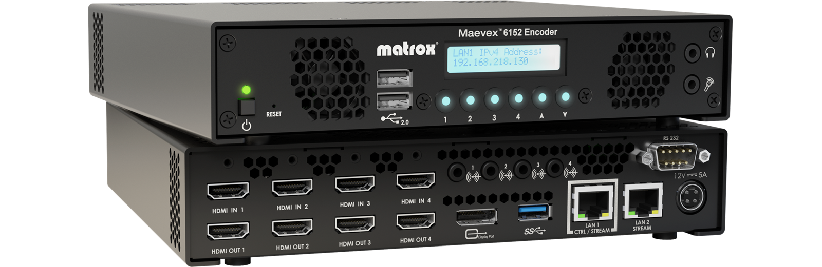 Matrox® Maevex 6152 is a quad HDMI® video encoder that delivers 4K60 input capture and encode, and supports at least four 4K streams and recordings—simultaneously. The encoder features six streaming protocols, multiple chroma sub-sampling, adjustable encoding parameters, zero-latency pass-through, and compositing, all in a convenient, quiet, low power, rack-ready appliance that fits almost any encoding application. The complimentary Maevex SDK enables you to build new applications or integrate the functionalities of PowerStream Plus into existing applications.