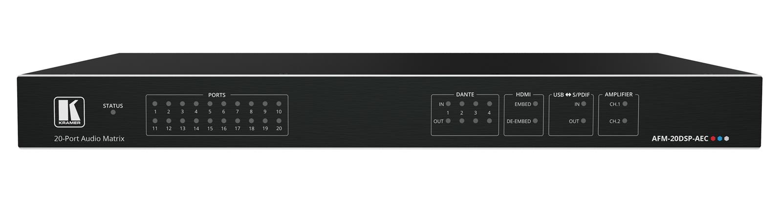 AFM−20DSP−AEC, a member of the Kramer XSPerience family of DSP products, is an advanced, professional audio matrix switcher with 20 analog ports that can be configured as inputs or outputs according to preset I/O configurations.