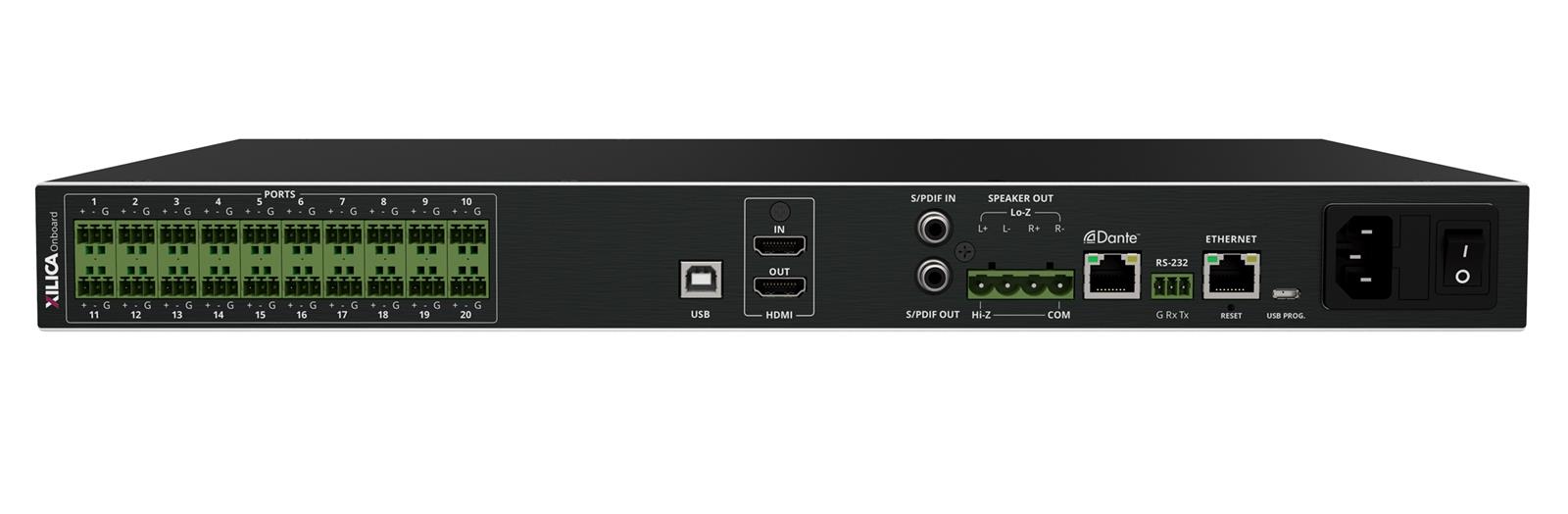 - Wide Range of I/O Formats — Includes 20 analog ports, 4x4 Dante interface, HDMI input and output, USB plug & play audio port, and S/PDIF input and output.