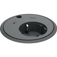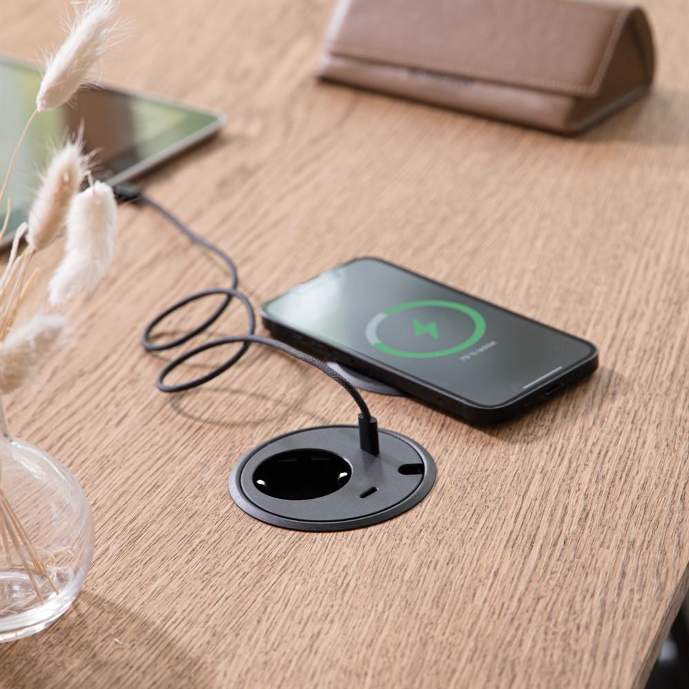 The Powerdot 17 provides two USB-C charging ports (2 x 30W) and features a convenient side hole for routing cables such as USB-C connections, network Cables or display cables. It is easily mounted through the table top in a 79 mm hole and is easily and securely screwed into place with a threaded ring under the top, without the need for an electrician.