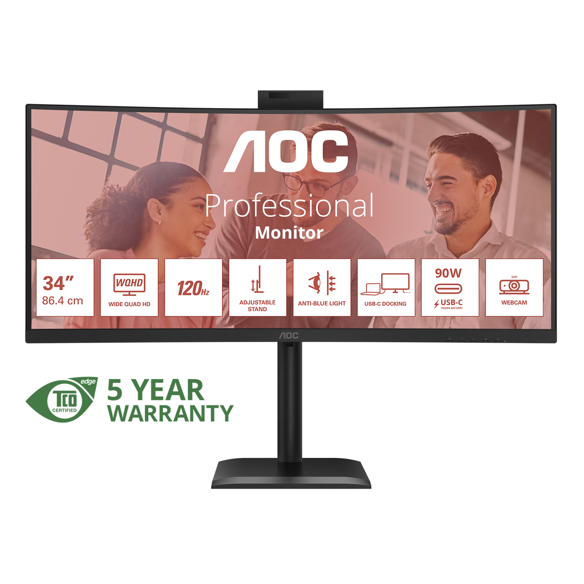 Experience the power of performance with the CU34E4CW. This 34" UWQHD monitor delivers stunning visuals at a smooth 120Hz refresh rate, enhanced by Hardware Anti-Blue Light and HDR10 for eye comfort and vivid clarity. Equipped with a 90W PD docking station, Smart KVM for seamless device control, and a built-in 5MP webcam, it's the all-in-one solution for modern multitasking and efficient hybrid workspaces.