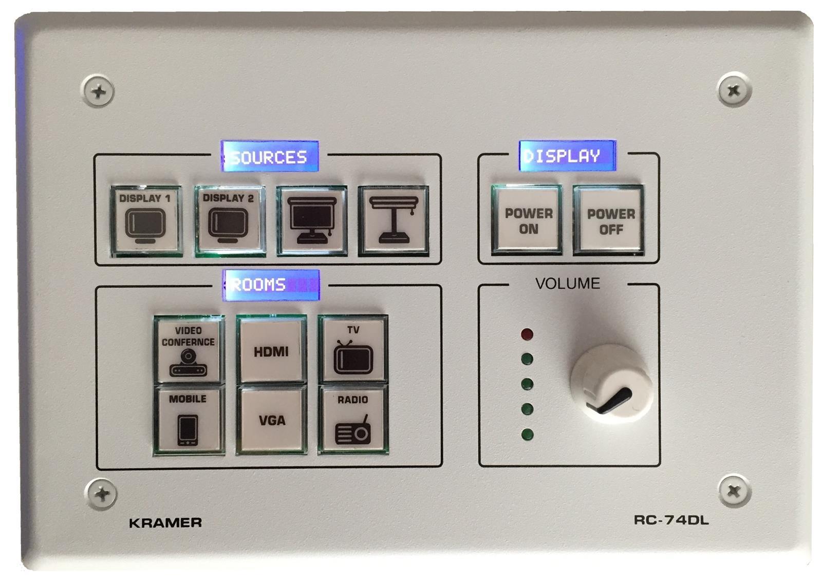The RC−74DL is a 12−button control keypad, with knob and LCD displays. It is a versatile device that connects to powerful control tools: over Ethernet it connects to Kramer's Site−CTRL™, a remote AV control, site management & monitoring system. For extended controlled device capacity it connects to LAN−connected control gateways. For remote keypad control it connects via KNET™ to master room controllers and auxiliary keypads. It flexibly serves either as a standalone room controller, part of multi−units KNET™ system, or part of multi−unit Ethernet system managed by Kramer Site−CTRL™ site management platform. The RC−74DL is ideal for auditoriums and meeting rooms, for convenient control of their complex multimedia systems and other room facilities such as screens, lighting and shades.